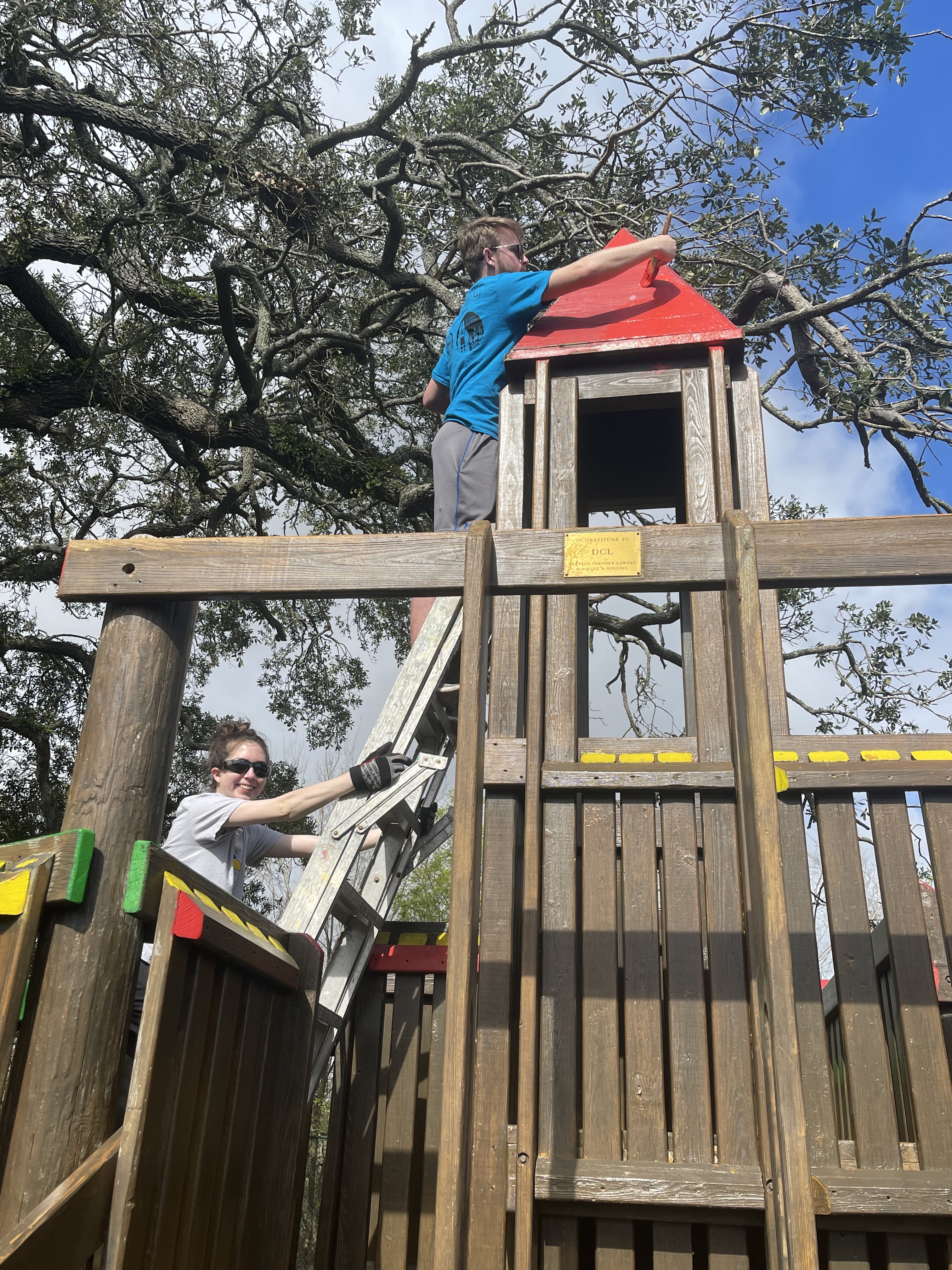 One project consisted of refurbishing a playground created by the community surrounding it for its 25th-anniversary celebration. We worked with the man and his wife who worked the playground into existence all those years ago. During the mornings and afternoons we worked on refinishing and repainting the structures, removing a wooden border surround the park, and uprooting tree trunks (which is a lot harder than one would think).
