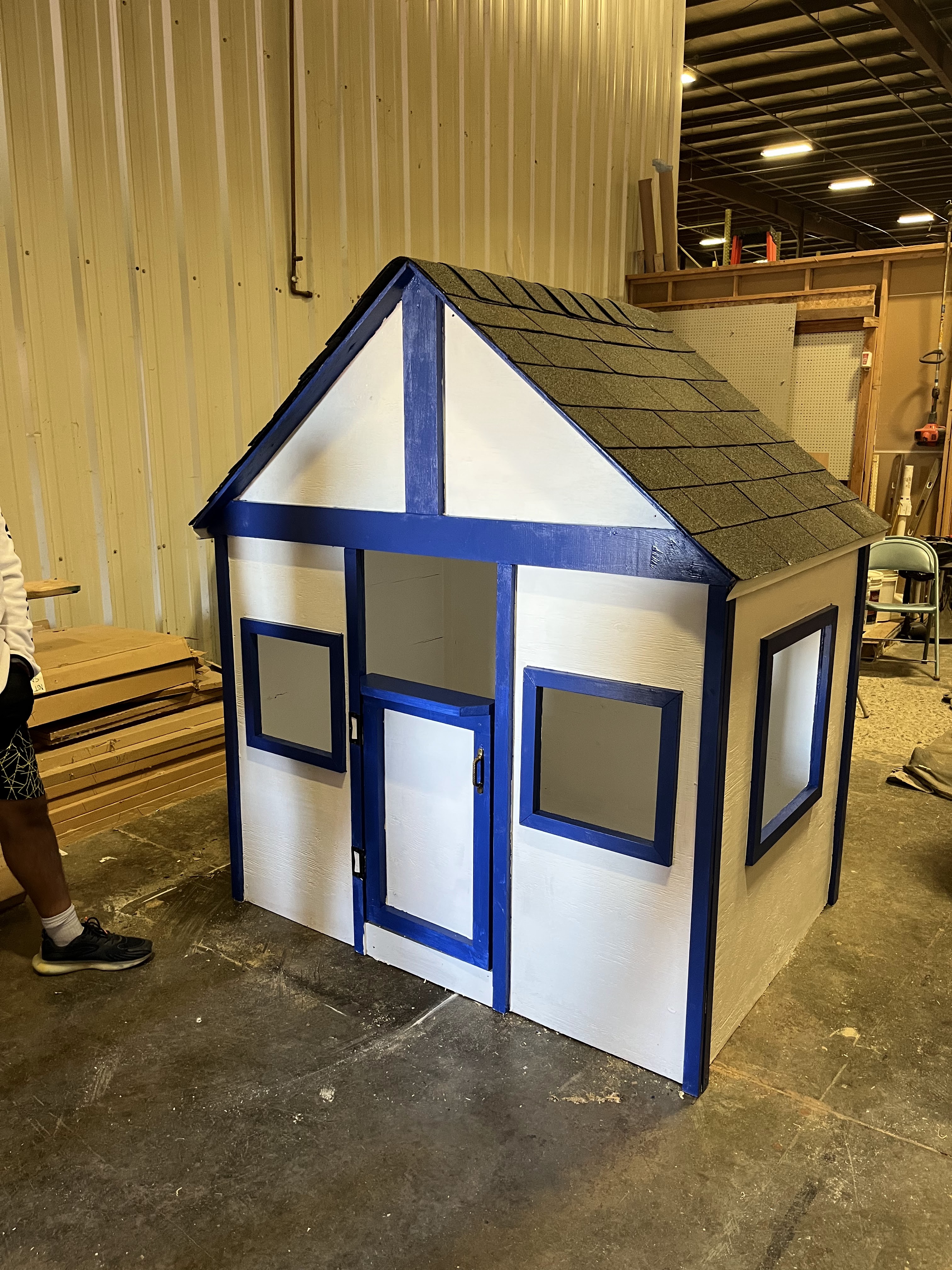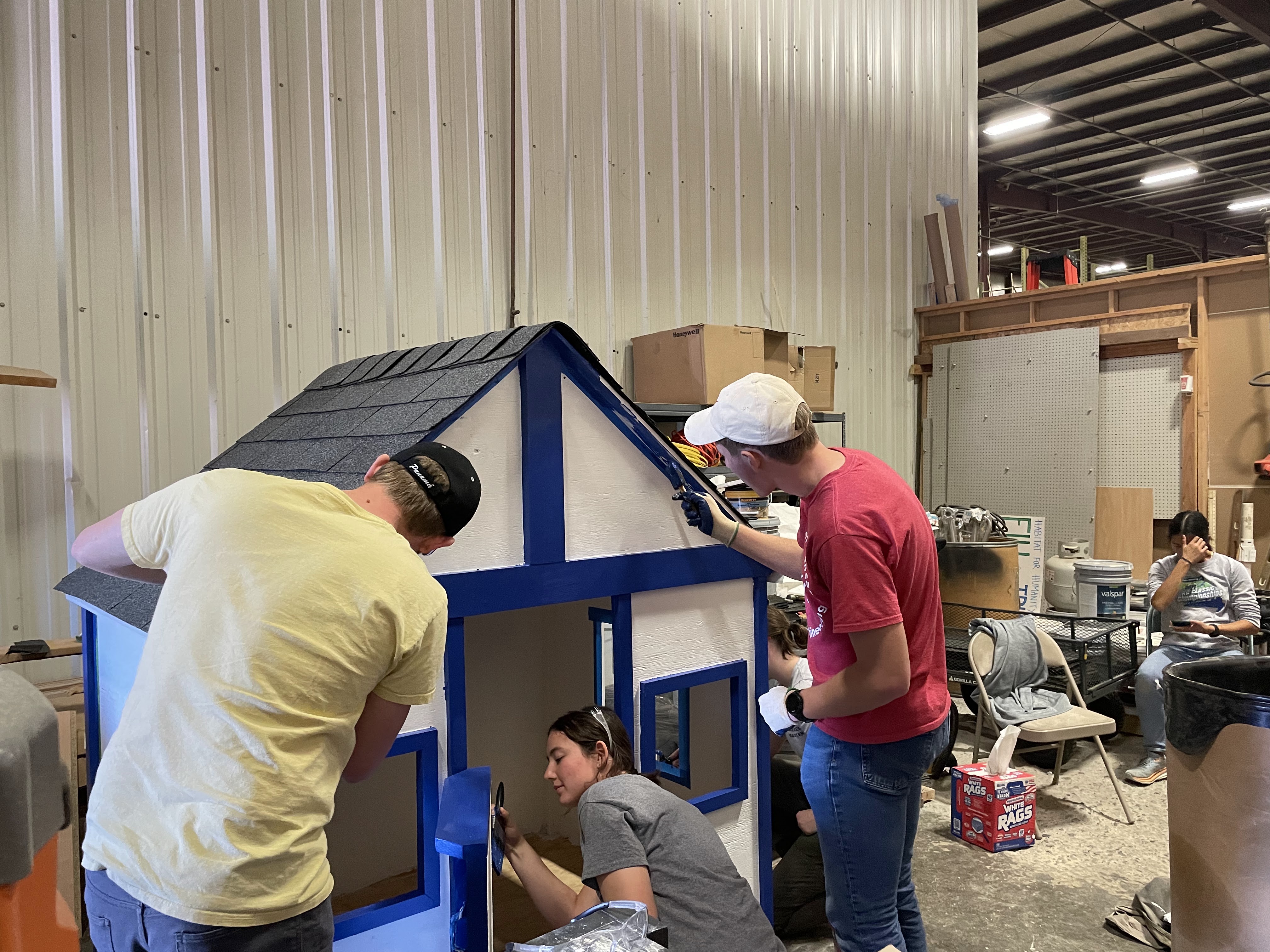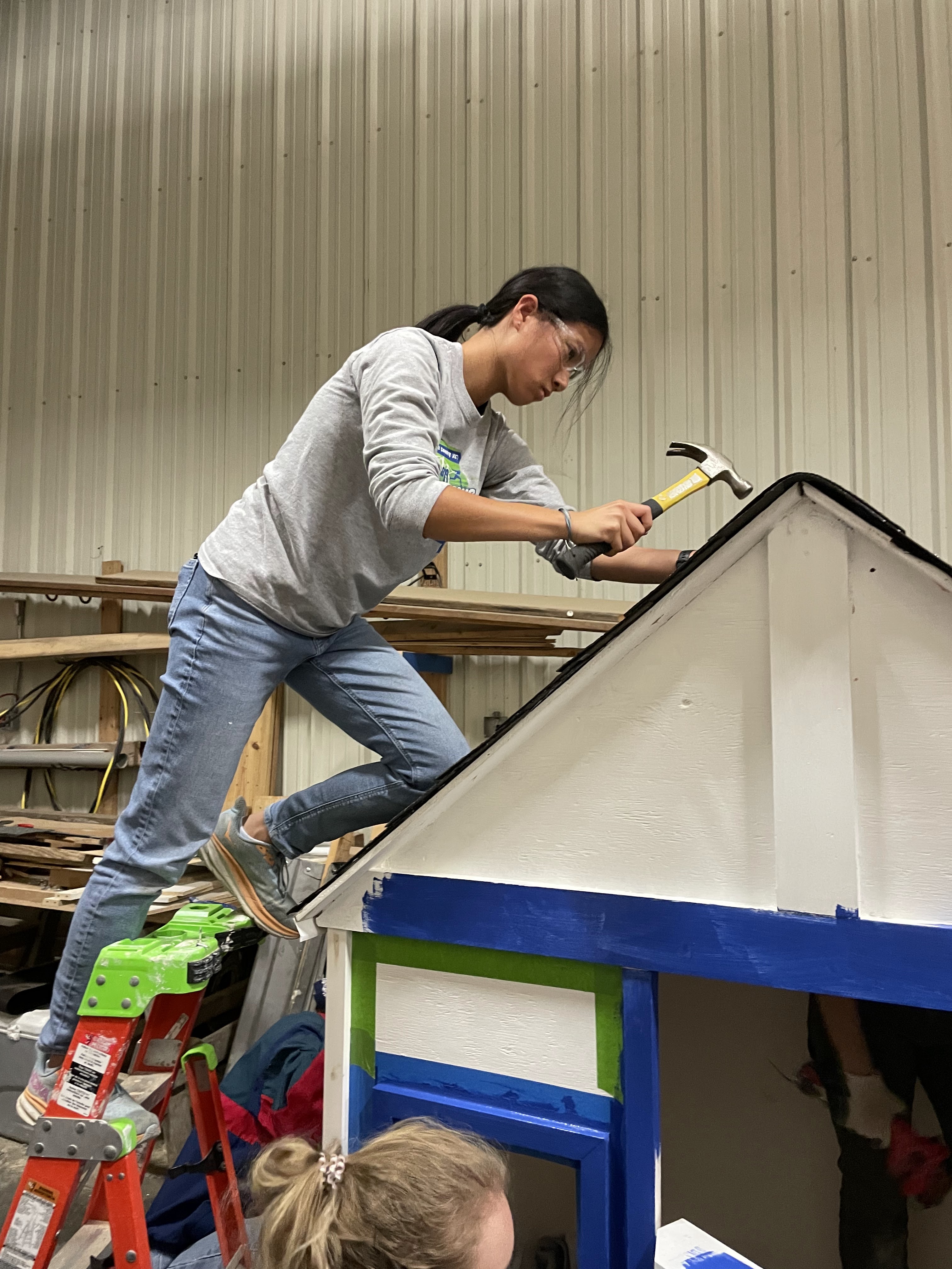For the 2023 Fall Break Project, KU EWB worked with Habitat for Humanity in Fayetteville, Arkansas. Our members worked building a playhouse from scratch that Habitat for Humanity will auction off to fund their projects. Some of the work we did included cutting the wood, nailing pieces together, and finally painting. We worked on the house for a total of two days, and on Sunday, we also went to a Frisco park and walked along the trail to collect trash. Some of the fun things we did included getting brunch, making dinners together, some board games, and movies. Overall, everyone had an awesome time helping out a great cause and had a ton of fun (EWB)onding!